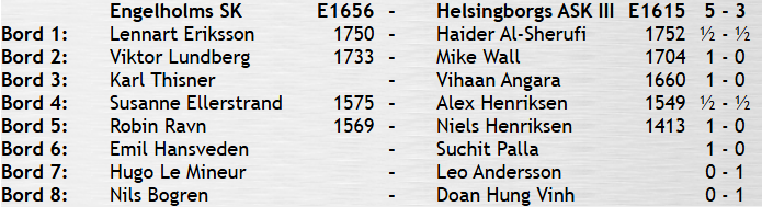 I lag tre gjorde Hung debut med en seger. Leo följde upp fint spel i juniorserien med en vinst. HASK fick även med sig två remier genom Haider och Alex som plockade var sin halva mot rutinerade motståndare.
