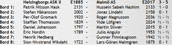 Även om förstalaget inte var riktigt nära poäng så bjöd vi MAS på en bra match. Extra plus till Staffan som spelade remi mot duktige juniorer Vide Löfgren och till Sion som kämpade länge och väl mot rutinerade Lars-Göran Malmgren.