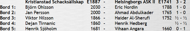 Första matchen i allskånskan är spelad. Det blev en förlust med 2-3 på bortaplan mot Kristianstad SS. Kristianstad kom med ett starkt lag och framför allt på toppborden fick vi det tufft. HASKs poäng togs av Vihaan, som har etablerat sig bra i seniorlagen, han fick in en kombination i mittspelet och tog hela poängen. Henrik spelade stabilt och fick med sig en remi. Haider spelade ett långt parti där båda spelarna hade chanser, partiet slutade remi.