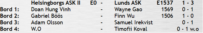 Gabriel vann på knock redan i öppningen. Adam och Hung var länge med i sina partier men det räckte inte till poäng. Tabellen för både lag ett och två finns här.