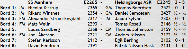 Manhem tog ledningen med 2½-1½ men HASK hade flera fina ställningar. Det visade sig också att trion Thomas Beerdsen, Jacob Sylvan och Egil Berling alla lyckades omsätta sina bra ställningar till vinster.