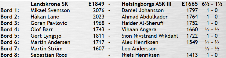 HASK III fick som väntat svårt i matchen mot Landskrona SK. Landskrona hade tre riktiga toppspelare i toppen på laget. Hemmalaget vann också med 3-0 på toppborden. HASK fick med sig tre remier genom juniorerna Vihaan Angara, Alex Henriksen och Leo Andersson.