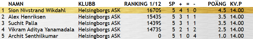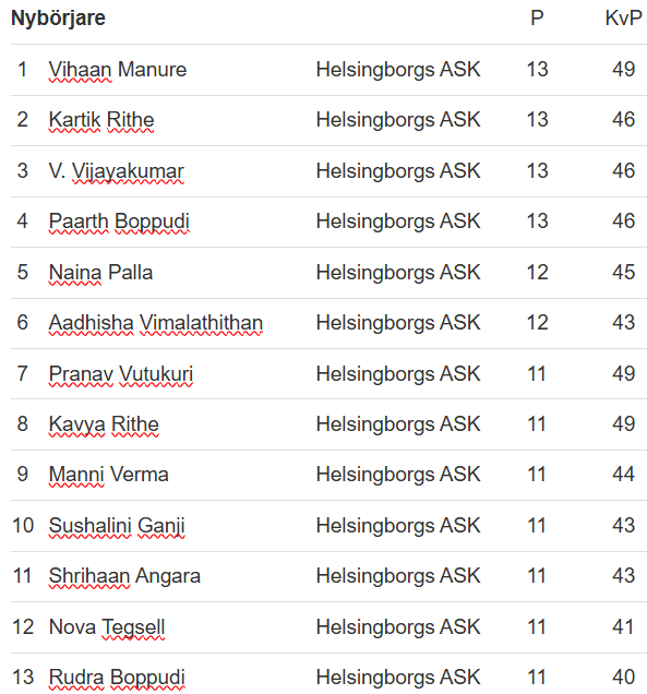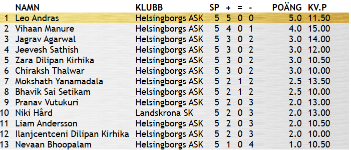 I nybörjarklassen startade 26 HASKare. Efter fem ronder med avdömning segrade Vihaan Manure på 13 poäng. Det blev väldigt jämt i toppen med fyra spelare som alla tog 13 poäng.
